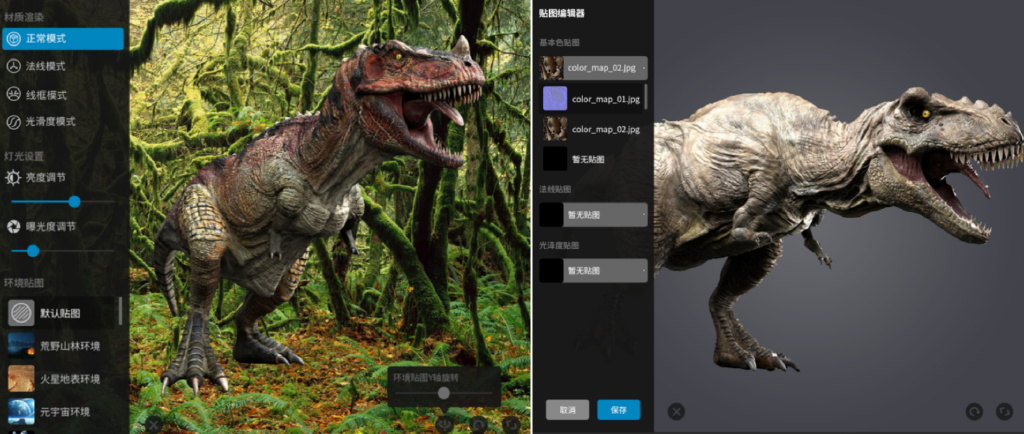 创作者上传3D作品时可以在线实时编辑,同时用户在线观看3D作品时也可以实时编辑,可以对展示的3D模型作品选择不同展示方式,例如:可以显示3D模型的结构线;改变材质渲染模式(含正常模式、法线模式、线框模式、光滑度模式等);可以对模型的亮度和曝光度等一些模型外观参数进行操作;可以自行切换选择预设环境贴图;用户还可根据自己的需求完成上传自定义环境贴图等操作。
