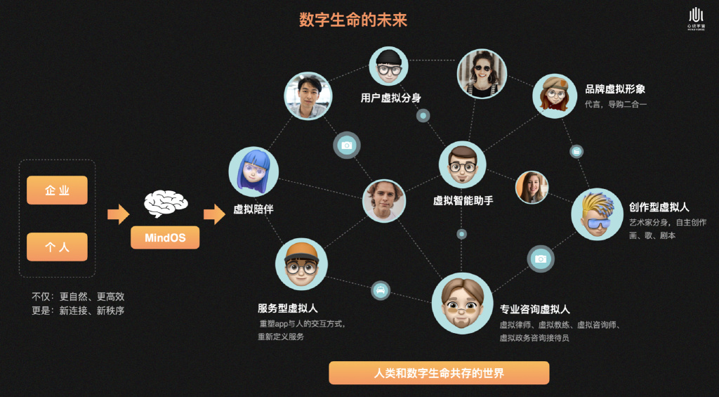 在心识宇宙团队看来虚实共存的世界里,信息的呈现、分发、消费、互动都会变得更自然、更沉浸、更个性化。而元宇宙中必然有一群数字原生的、有情感、有温度的虚拟心识,以数字生命的方式融入到每个人的生活场景之中,与用户建立更沉浸、更深度、更长久的“情感连结”。这些AI角色不仅使个人生活、品牌服务、公共社区的交互更自然、更高效,并且他们自身就成为通过数字原生身份存在的新型连接形式,塑造新的服务和商业秩序。