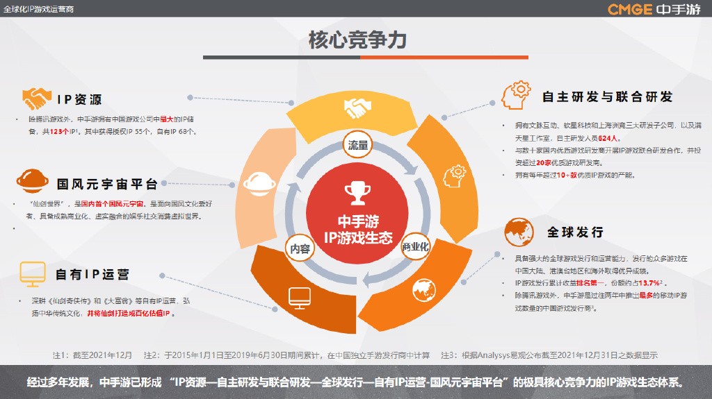 中手游是国内知名全球化IP游戏运营商,公司以IP为核心,通过自主研发和联合研发,为全球玩家提供精品IP游戏,打造极具竞争力的IP游戏生态体系。经过多年发展,中手游已形成“IP资源—自主研发与联合研发—全球发行—自有IP运营-国风元宇宙平台”的IP游戏生态体系,并借此于激烈市场竞争中仍然保持了稳健发展的良好态势。