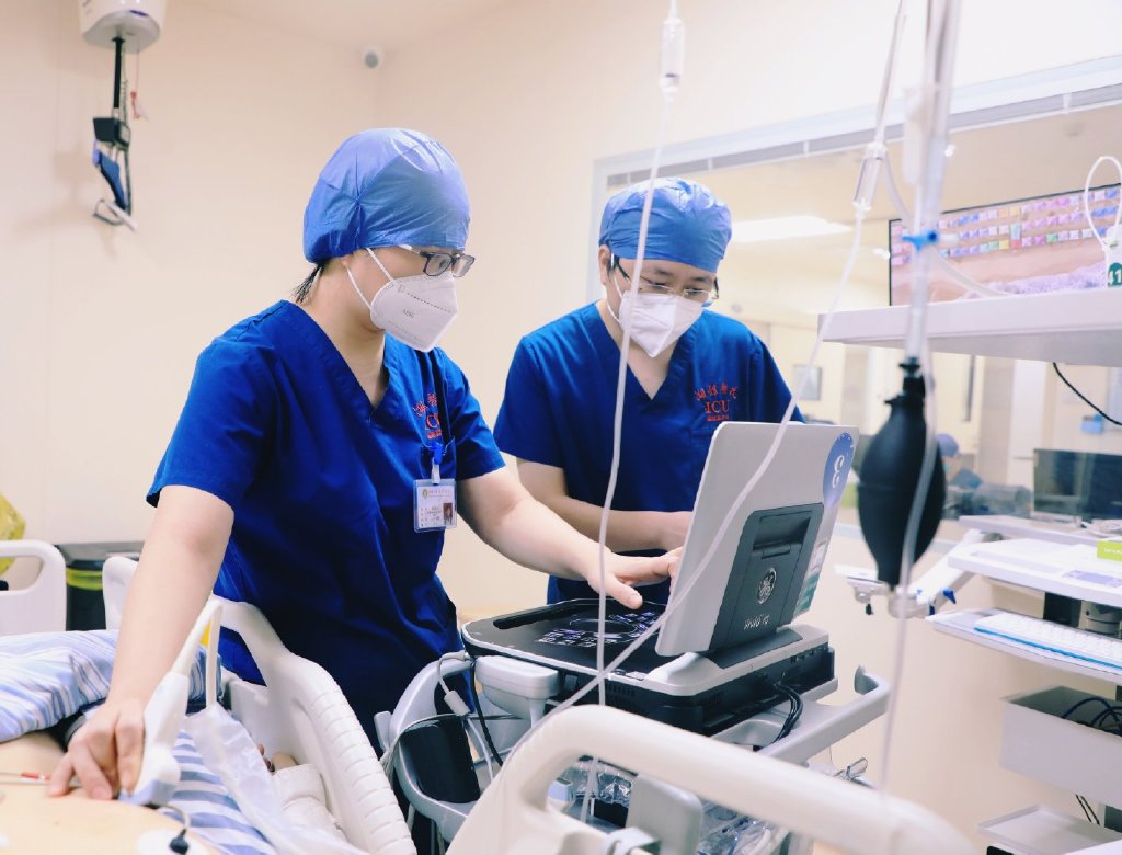 (中南大学湘雅医院重症ICU内,张丽娜教授在用重症超声评估患者病情。)