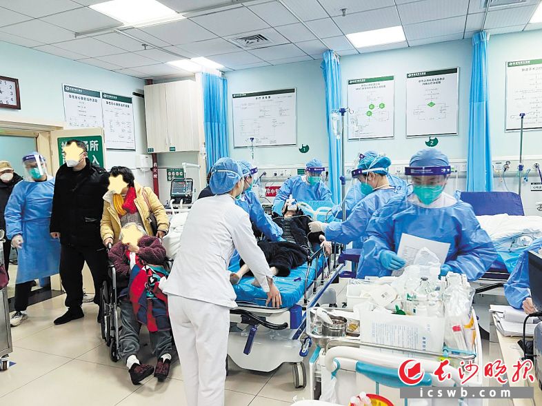 “让让让让,病人进来了!”“准备过床,1、2、3!”“血氧不好,快快,上呼吸机!”编制5张床位的抢救室,最多时加床一倍,让原本就不大的空间更加逼仄。就在这个方寸之地,护士们一天连走带跑上万步是常有的事。