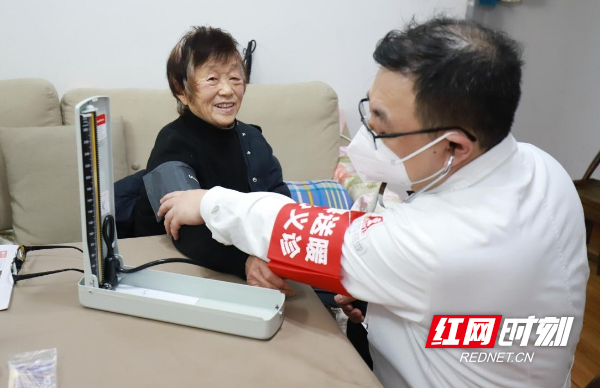 测量血压。81岁高龄的彭娭毑在爱心义诊后,乐呵呵地说道:“真是太感谢你们了,你们太好了,我觉得很暖心的。”