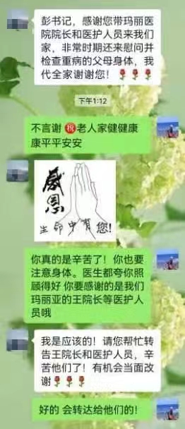 感谢信。喻嗲嗲瘫痪在床、妻子经多次大手术,由女儿喻女士全职在家护理,她向彭芳副书记发来感谢信,“非常时期你们还上门慰问并为重病的父母检查身体,我代全家谢谢你们,有机会一定上门感谢百佳玛丽亚的医护人员。”