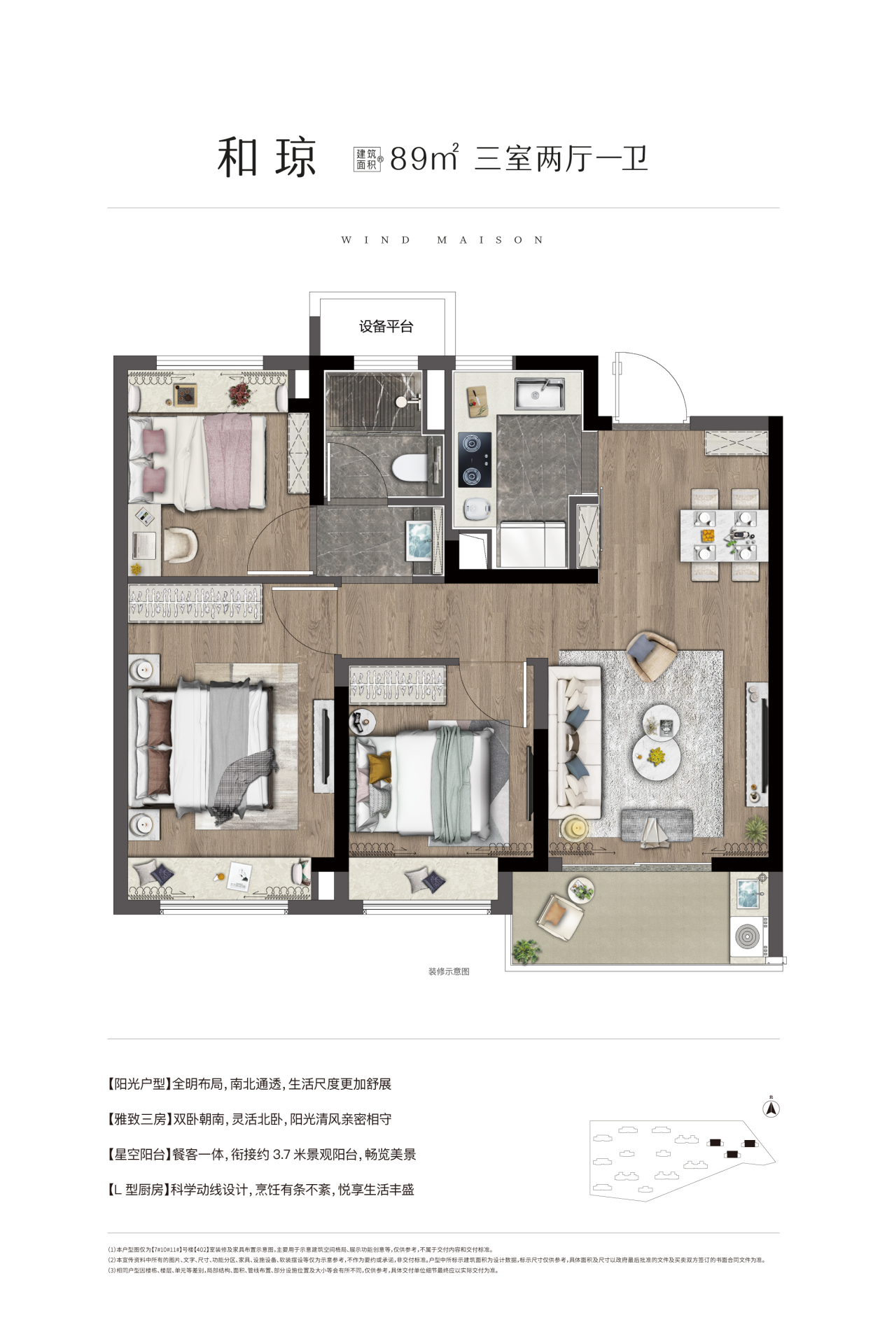 89㎡的和琼小户型,三开间朝南,该户型以其总价低、利用率高、实用性强等优点深受购房者尤其是年轻小夫妻喜欢。