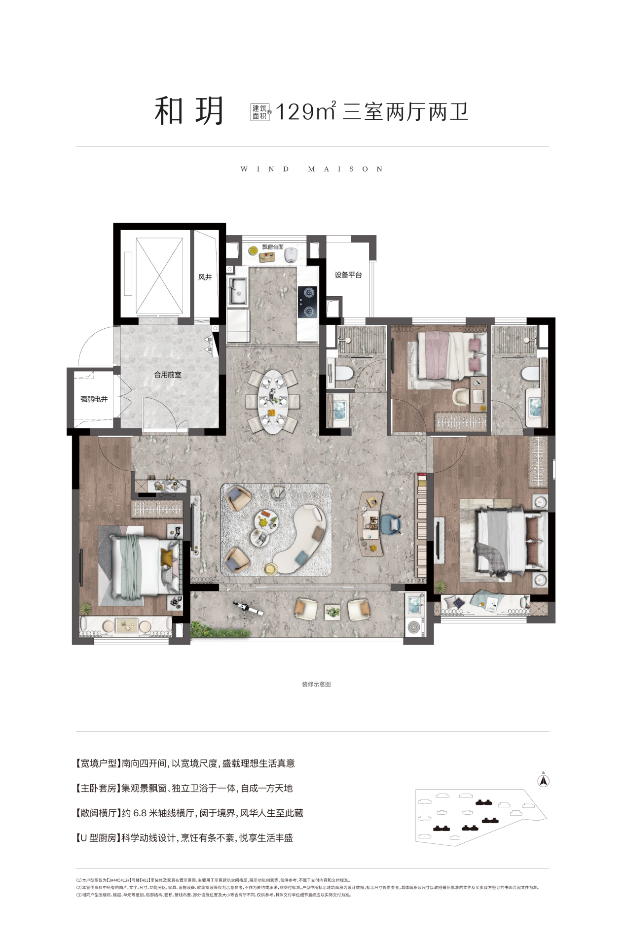 129平米和玥户型户型,四开间朝南设计,约6.8㎡的奢阔横厅,主卧套房设计,步入式衣帽间,享受私密尺度生活,同时可以很好满足二胎家庭和老人同住的空间需求。