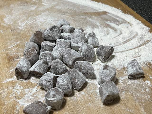 4、面团搓长,撒上干面粉,切成小面剂;