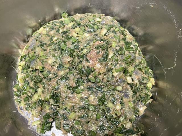 7、搅拌均匀,感觉咸味不够,再放点盐,继续搅拌至黏稠就可以了。这个馅特别的鲜,非常好吃。