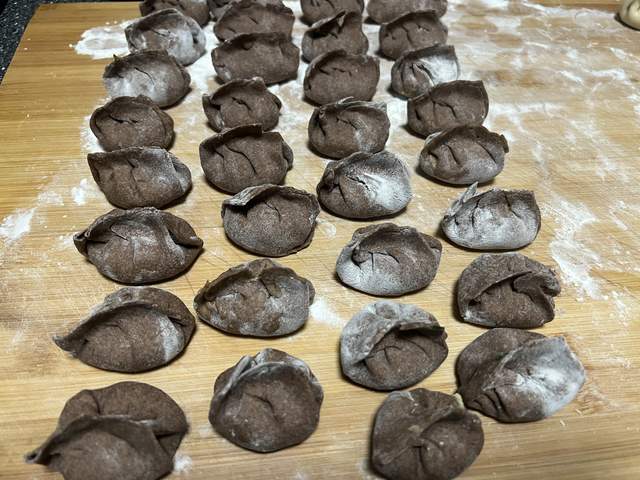 每年春节我们家都会包一些彩色饺子,比如用南瓜泥揉面做成黄色的,菠菜汁揉面做成绿色的,紫薯揉面做成紫色的,这次可以再加上黑全麦的饺子了,过年回家给父母包饺子,就安排这个黑全麦饺子吧!