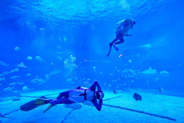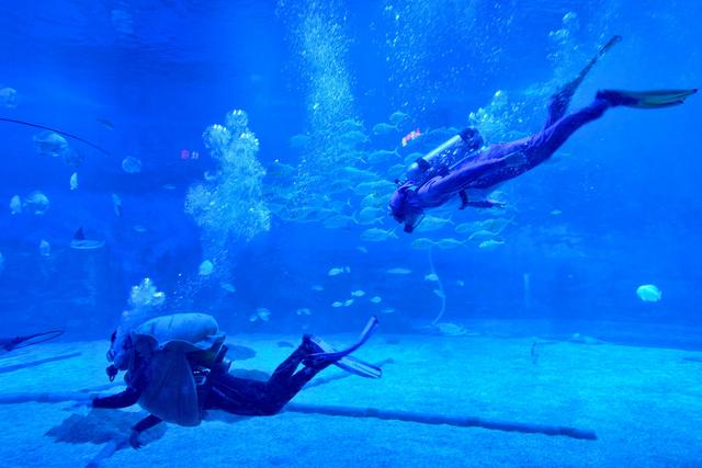 据悉,本次水下“龟兔赛跑”表演是烟台海昌鲸鲨海洋公园针对寒假以及春节特别推出的一个节目。前期由数名水下演员经过近两周的排练,节目才得以呈现。“因为演员要穿乌龟和兔子的衣服,而这些衣服在水下就会变得非常的沉重,要克服水下阻力和浮力,潜水员要背负近40斤重的铅块,负重训练。”