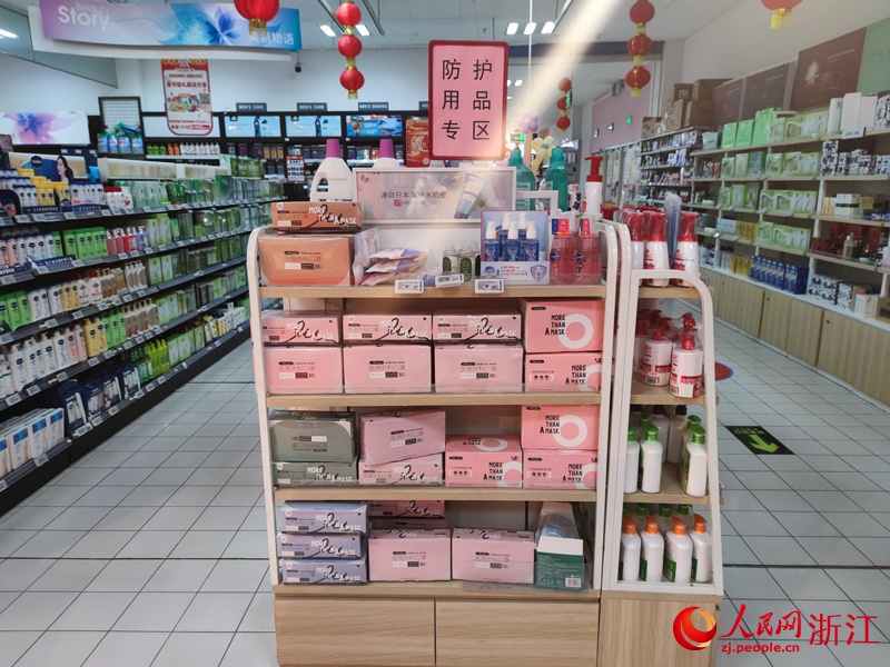 杭州市区一大型商超入口处设置了防护用品专区。人民网 康梦琦摄商超药店:防护物品摆在显眼位置