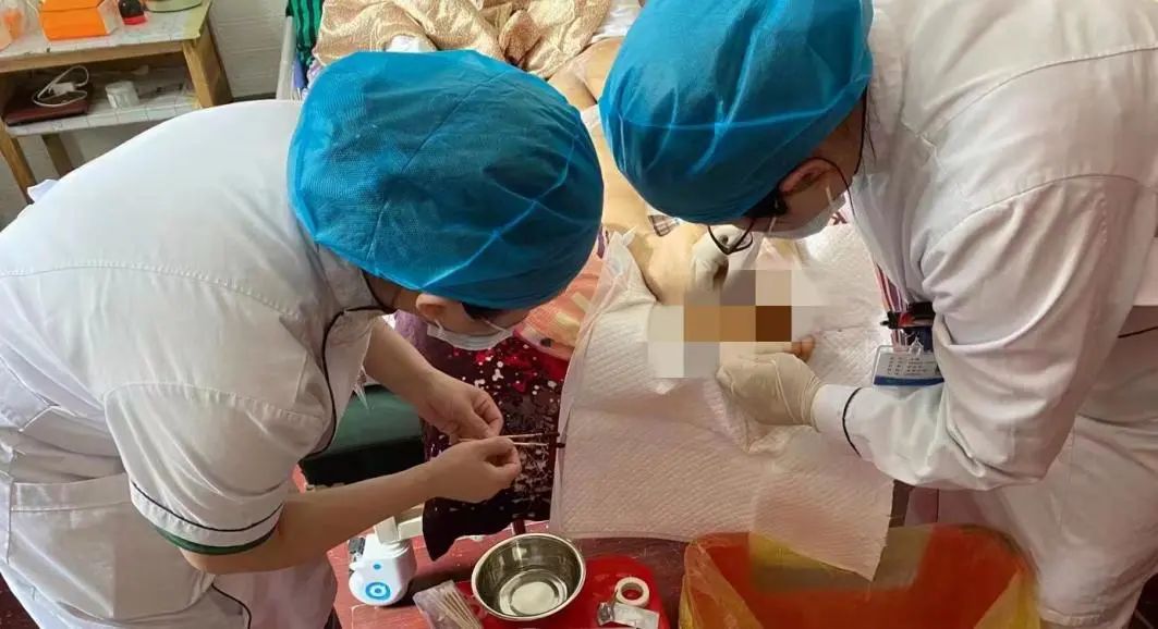 护理人员上门为一位瘫痪卧床的老人进行清创护理
