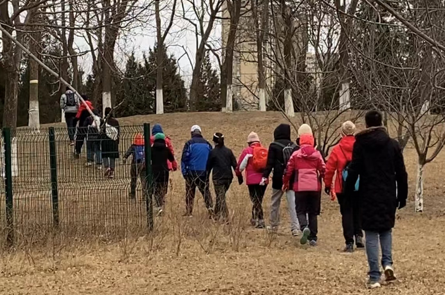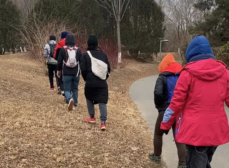 杨晓莉介绍,自己在队伍中承担起“安全员”的角色,负责提醒大家在行进过程中注意安全。“我就在队伍中间,因为我声音比较洪亮,所以就负责提醒大家是否该拐弯了、是否有岔路口之类,前面有突发情况的时候,我就大声喊注意安全、注意脚下,有的时候路面有冰,很滑,我们就在关键的时候提醒他们一下。”
