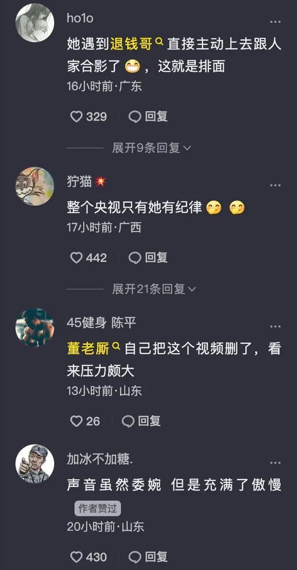 后来,董老厮已经把这个视频删除了,明显是压力巨大。网友开始炮轰“声音虽然委婉,但是充满了傲慢!”、“整个央视,就她有纪律!”