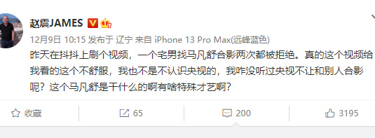 知名记者赵震老师看了这段视频也表示不舒服,称:“一个宅男找马凡舒合影两次都被拒绝。真的这个视频给我看的这个不舒服,我也不是不认识央视的,我咋没听过央视不让和别人合影呢?这个马凡舒是干什么的啊有啥特殊才艺啊?”
