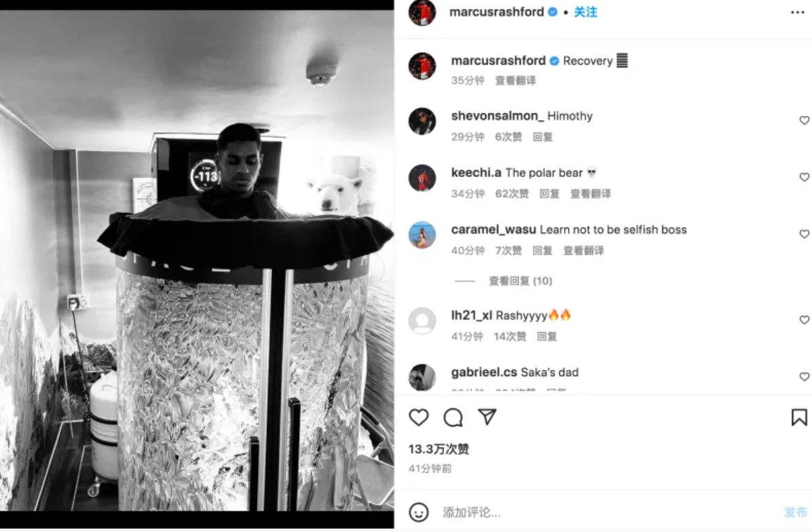 拉什福德晒出了自己训练后用液氮冷疗舱进行恢复的图片,配文中拉什福德写道:恢复。