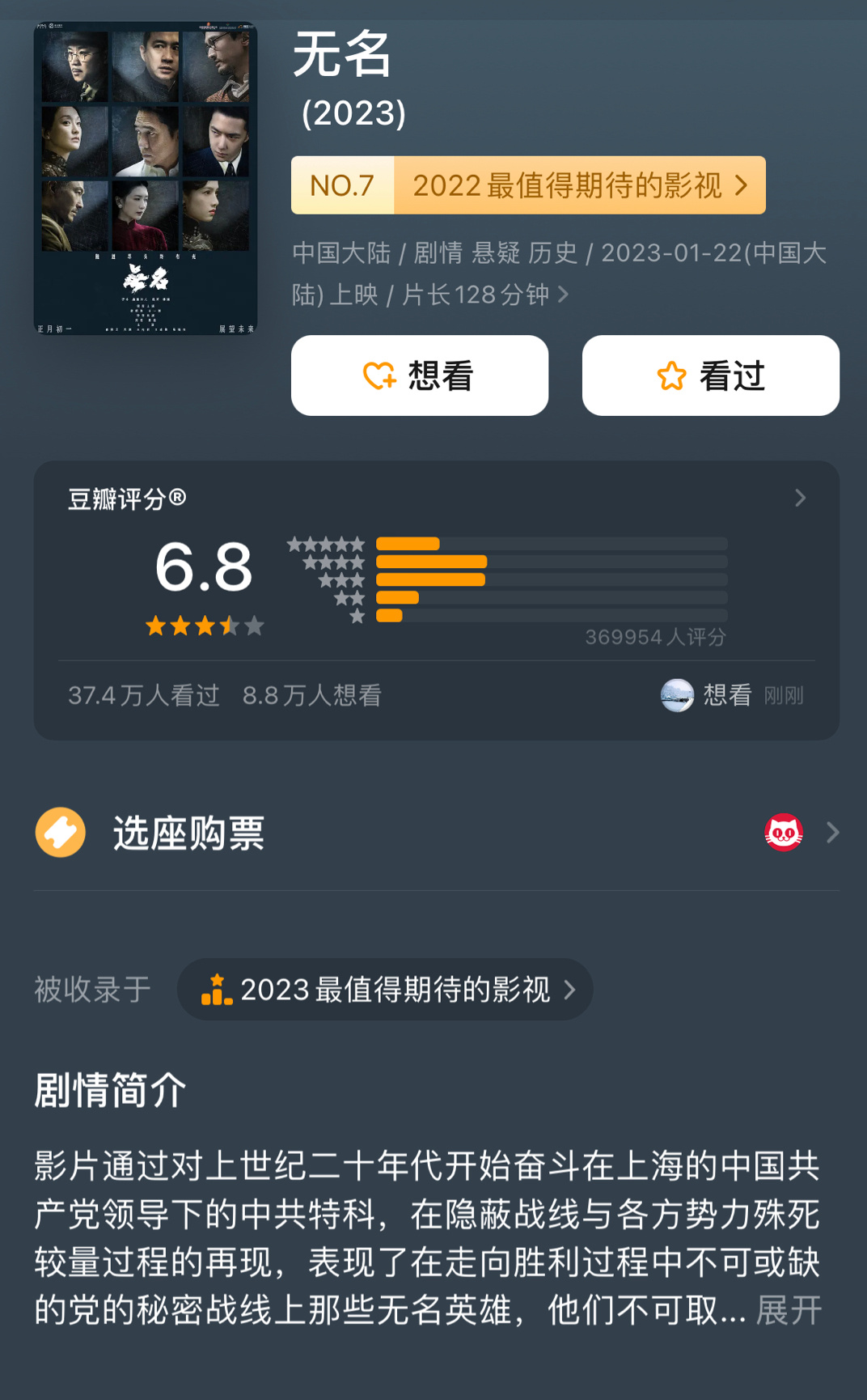 #今年春节档电影你看了几部##无名豆瓣开分6.8#