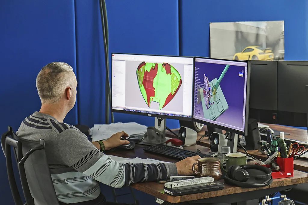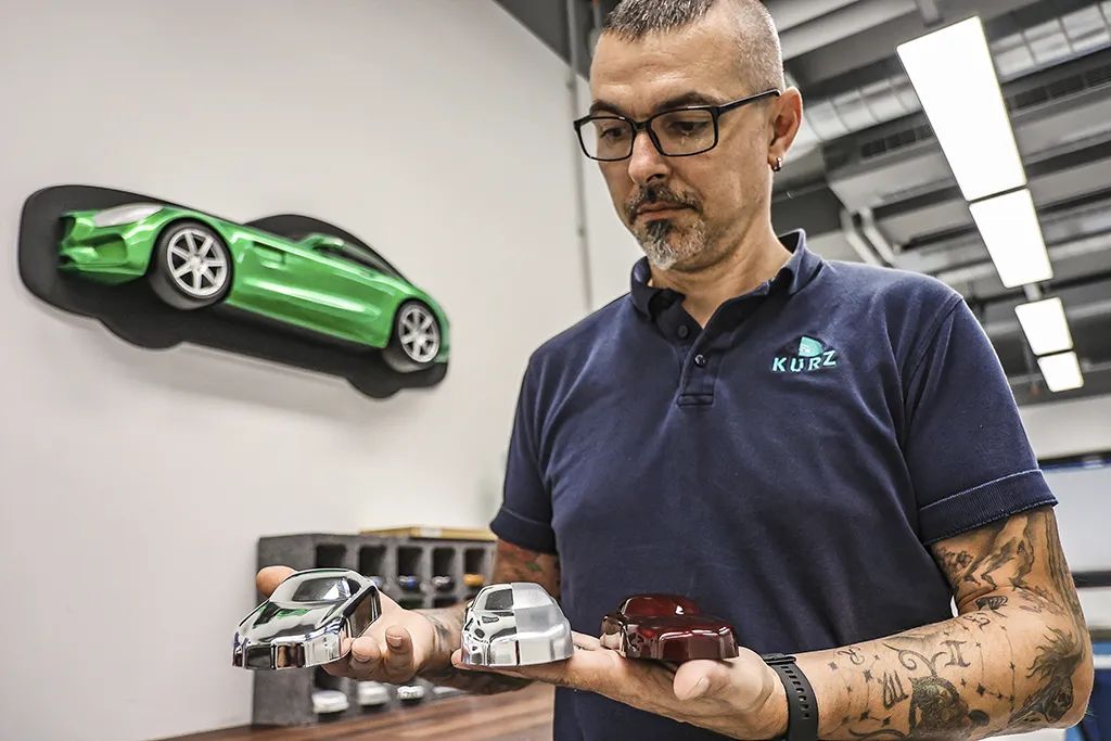 “在我们这里,根据用户的创意,有形产品可在数小时内被创造出来”,第三代公司管理经营者尼可·库尔茨(Niko Kurz)向我们解释道,总的来说,公司结构比较复杂。之所以复杂,是因为各个产品及其生产流程都有所不同。“实际上没有什么是我们生产不了的”,库尔茨说:从仪表板、中控台中发挥作用的支架和小部件到发动机缸体或保险杠。然而,所有这些产品的开发都是保密的。因为公司参与了主要汽车制造商的开发过程,因此保密工作至关重要。例如,这些刚刚从3D打印机出来的小装饰部件就是属于某个一级方程式车队的。它们可将空气动力学的优势发挥到极致,但若是竞争车队得到风声,那么对于车队来说将是致命的打击。