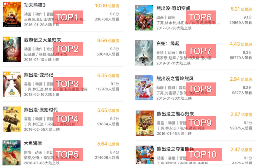 国产动画票房前十里面,「熊出没」居然占了6部,总计票房达到25亿多