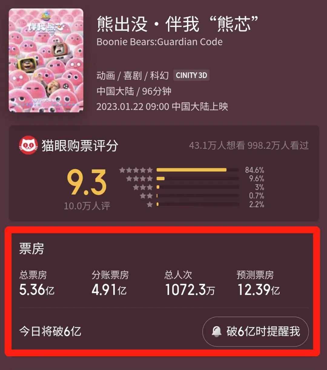 还是以9.77亿票房的2022年那部「熊出没之重返地球」为例