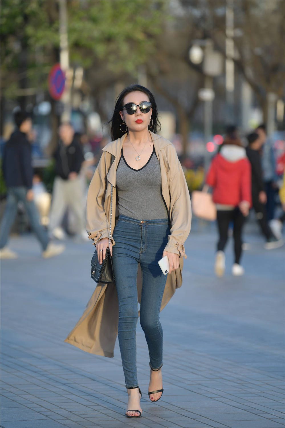 精致的美女,知道怎么搭配更好一些,也会衬托自己身材,细跟凉鞋,一直受到美女的喜欢,也搭配出简约的风格,这位美女选择黑色的一字带细跟凉鞋,非常舒服的搭配,也穿出简约的效果,如果你也喜欢细跟凉鞋,可以尝试一下,8厘米的高度,增高显瘦,搭配蓝色的紧身牛仔裤,高腰的款式,裤腿刚好到脚踝的位置,灰色的修身衬衣,黑色的镶边,搭配一件卡其色的风衣,很薄的款式,走路有着带风的效果。