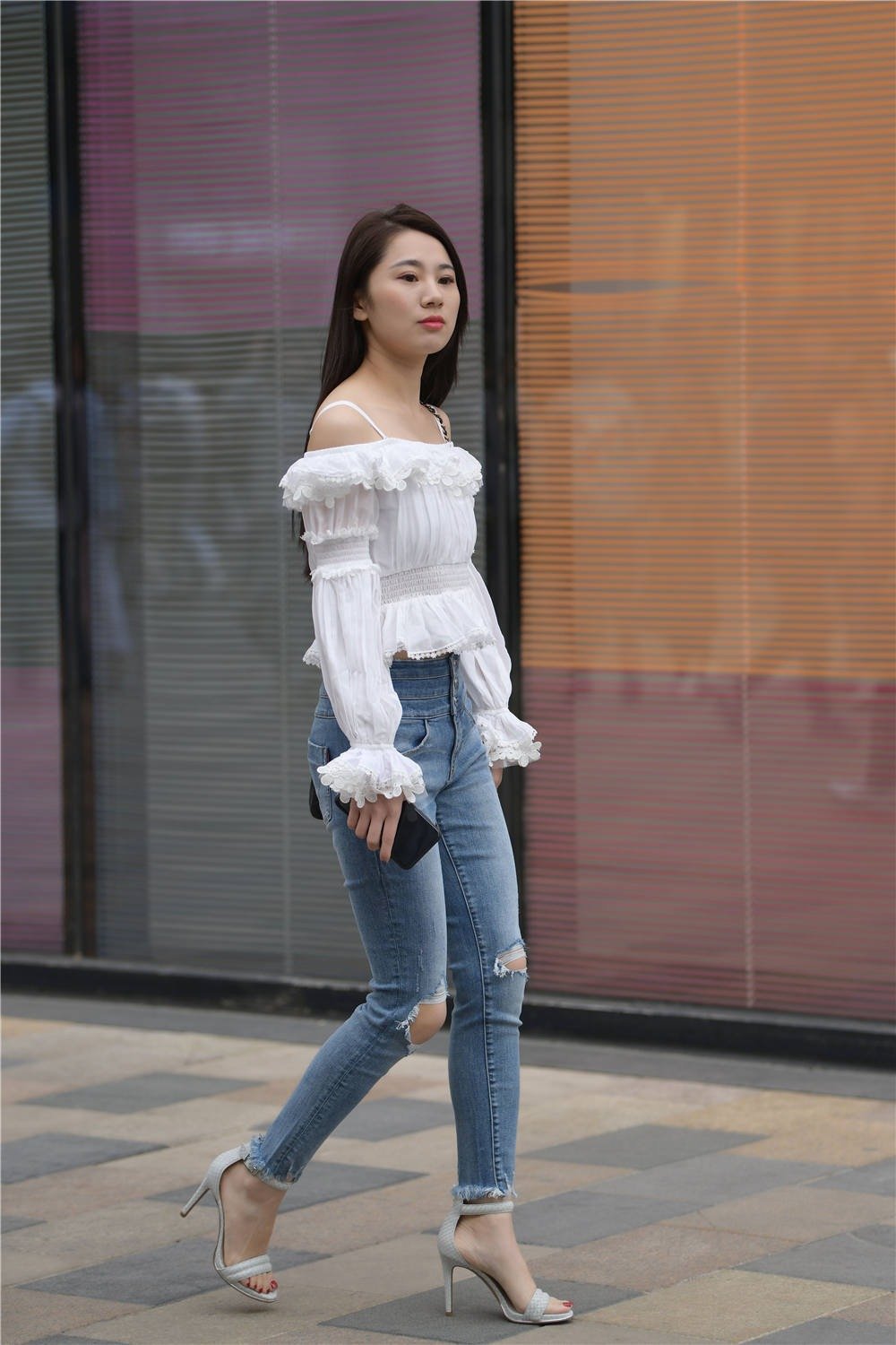高跟鞋带来很大的改变,穿着高跟鞋的美女,也会变得更加自信,很多到时尚街区的美女,自然会选择高跟鞋,细跟凉鞋也是非常受欢迎的,这位美女选择浅灰色的一字带细跟凉鞋,8厘米的高度,衬托身材效果很好,也是非常简约的设计,搭配是要有点自己的想法的,看起来简简单单,却搭配出不一样的感觉,搭配蓝色的紧身牛仔裤,高腰的款式,细跟的破洞增加点缀,毛边的裤腿,穿着一件白色的吊带小衫。