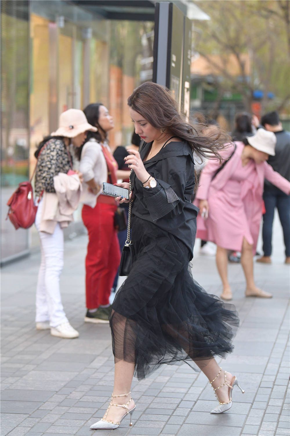 穿着高跟鞋的美女,也是非常自信的,她们知道怎么搭配更好一些,这位美女选择一双浅蓝色的尖头细跟铆钉凉鞋,双层的铆钉带,鞋子更加合脚,8厘米的高度,增高显瘦,也看出美女非常会搭配高跟鞋,走路也很自然,搭配一件黑色的薄纱连衣长裙,层次感更多一些,时尚漂亮,美女还选择一件小外套,很薄的款式,起到了防风的效果。