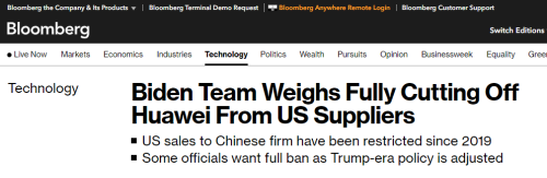 据美国彭博社报道,拜登团队正在考虑全面切断中国华为公司与美国供应商的联系。华为是最早受到美国出口限制打击的中国高科技公司之一,目前美国供应商需要获得政府批准才能向华为出售产品,然而最近一段时间,那些申请全都搁浅了。