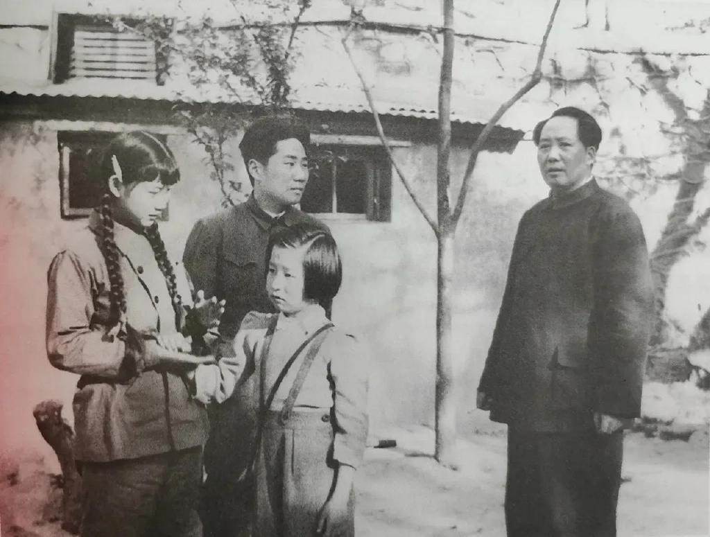 毛主席站在不远处,看着这三个人。这仨人,站在毛主席的角度,一个是英俊帅气的大儿子,一个是温柔漂亮的未来儿媳,一个是活泼可爱的小女儿。