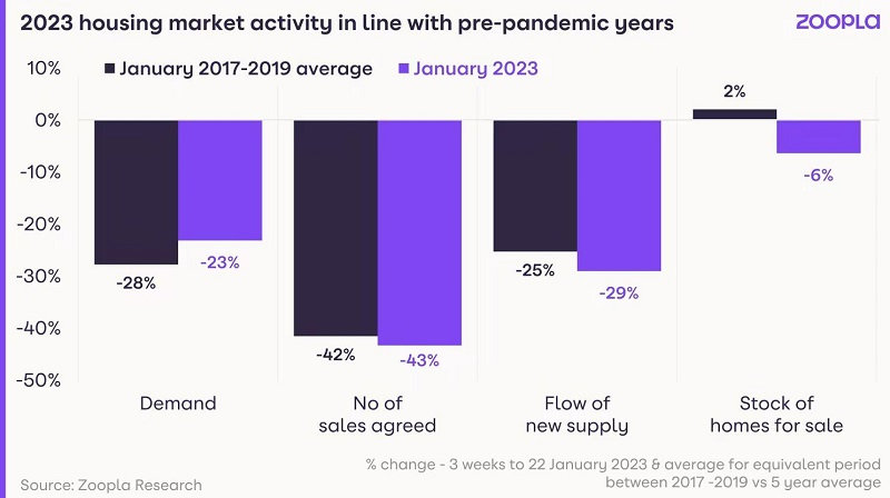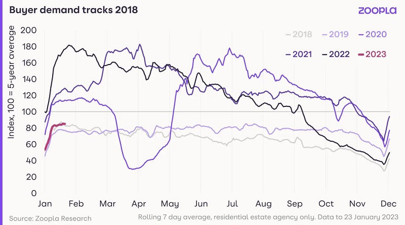 房屋需求在 2023 年的前几周出现反弹,但仍远低于 2020 年 1 月至 2022 年 1 月的水平。目前买家的兴趣与大流行前的年份一致,比 2019 年高出 10%。