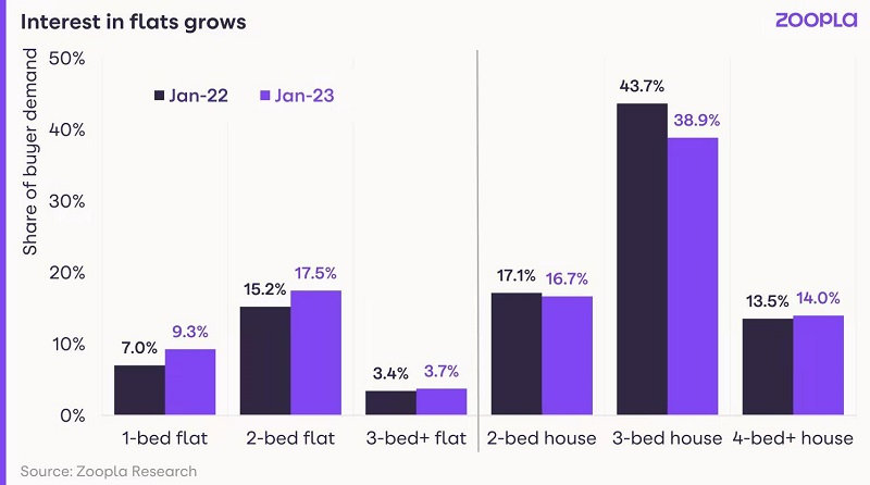 2023 年头几周的一个明显趋势是,为了应对更高的抵押贷款利率对购买力的打击,买家变得更加注重价值。我们已经看到需求明显转向公寓,寻找三居室房屋的买家有所减少。