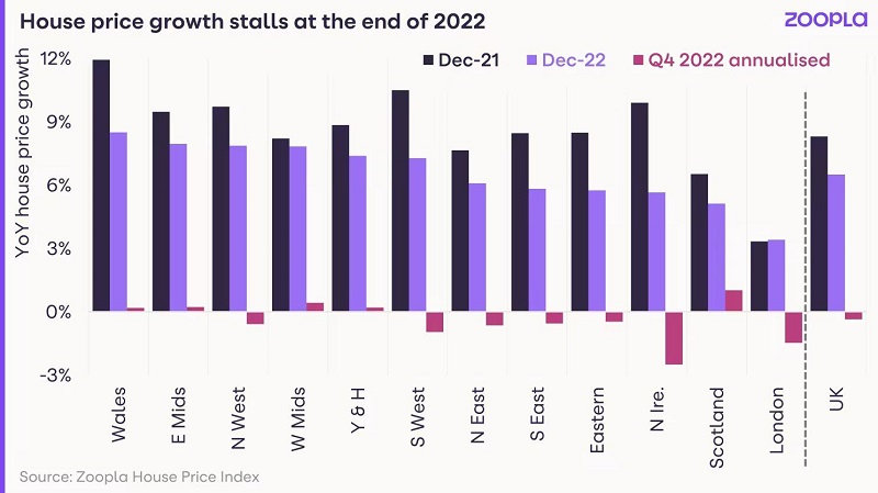 1. 英国房价增长在2022年第四季度陷入停滞,将房价年通胀率拉低至+6.5%