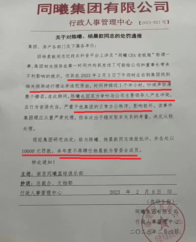 昨天,同曦集团公司针对杨晨歆自称“同曦CBA老板娘”称谓一事进行了通报处罚,公司认为杨晨歆这种行为对公司和董事长带来不利影响!在2023年2月3日下午,杨晨歆到集团找到相关领导进行理论并追究缘由,时间持续一个半小时,吵闹声弥漫整个楼层。与此同时,陈曦也与公司主要领导人产生冲突,行为言语失当,严重干扰集团正常办公秩序,影响极坏。