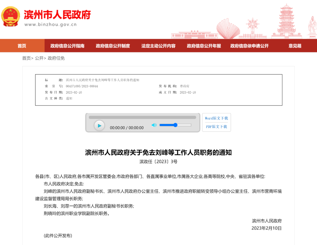 刘峰的滨州市人民政府副秘书长、滨州市人民政府办公室主任、滨州市推进政府职能转变领导小组办公室主任、滨州市营商环境建设监督管理局局长职务;
