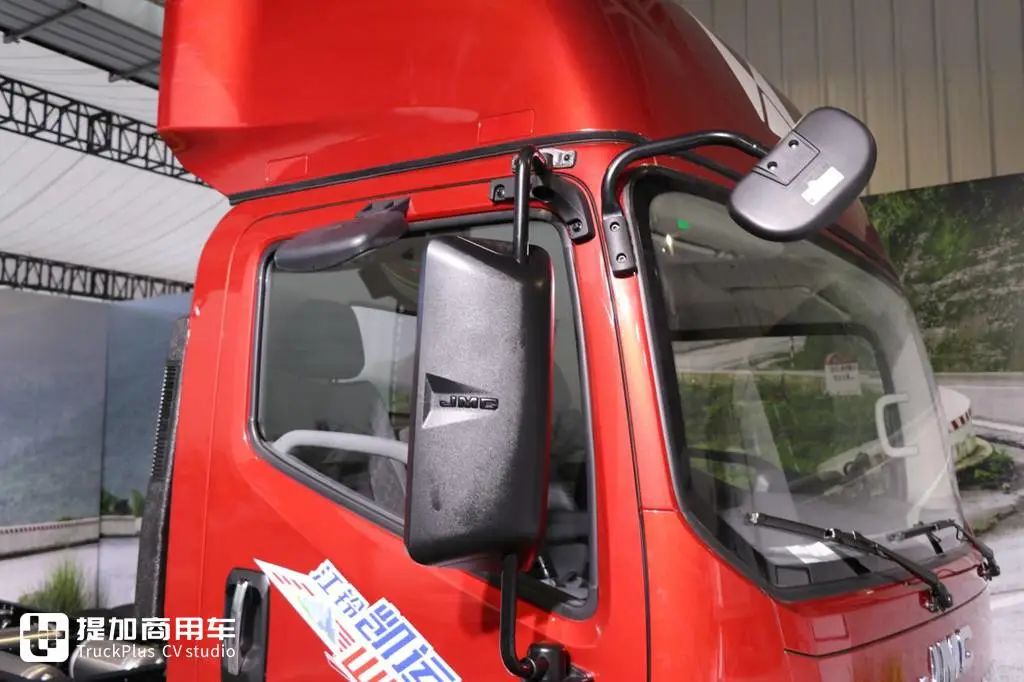 后视镜采用一体化的设计,进一步降低风阻系数,在镜壳上还带有JMC的标识,同时内部镜片可实现加热功能。除此之外,车辆还配备前方和侧方的照地镜,盲区再度减小。