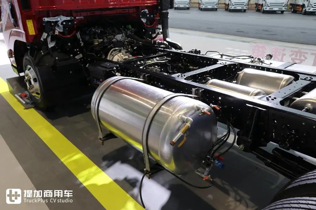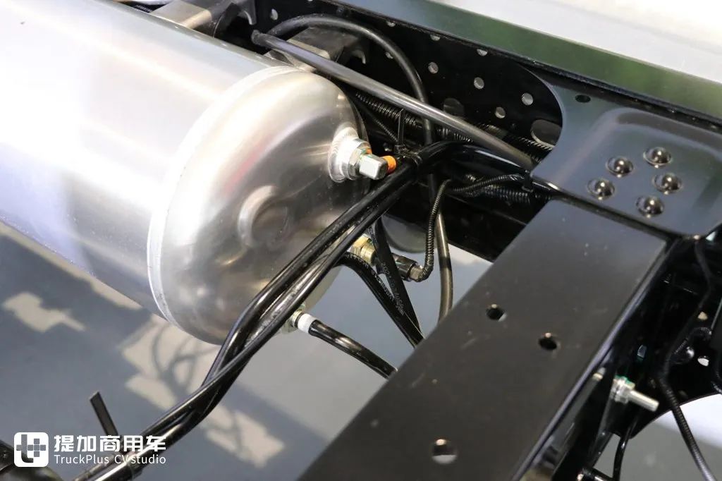因为是展车,所以为了展出效果在车上加装了水罐,这一点主要是为了给刹车鼓进行降温,防止制动热衰减导致的刹车失灵。而山区版在出厂时,为了方便用户改装淋水罐和管路,在气瓶上有预留接口设计,用户无需改动即可加装气压淋水,在方便的同时也保证了整车气路一致性和安全性。