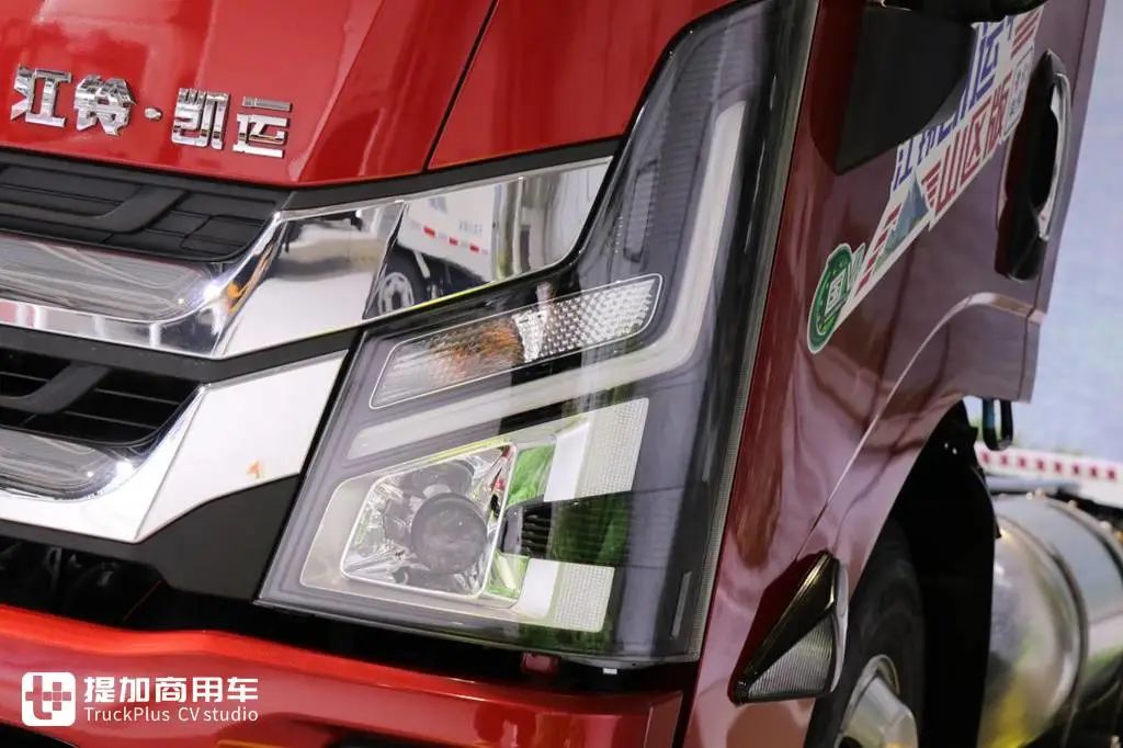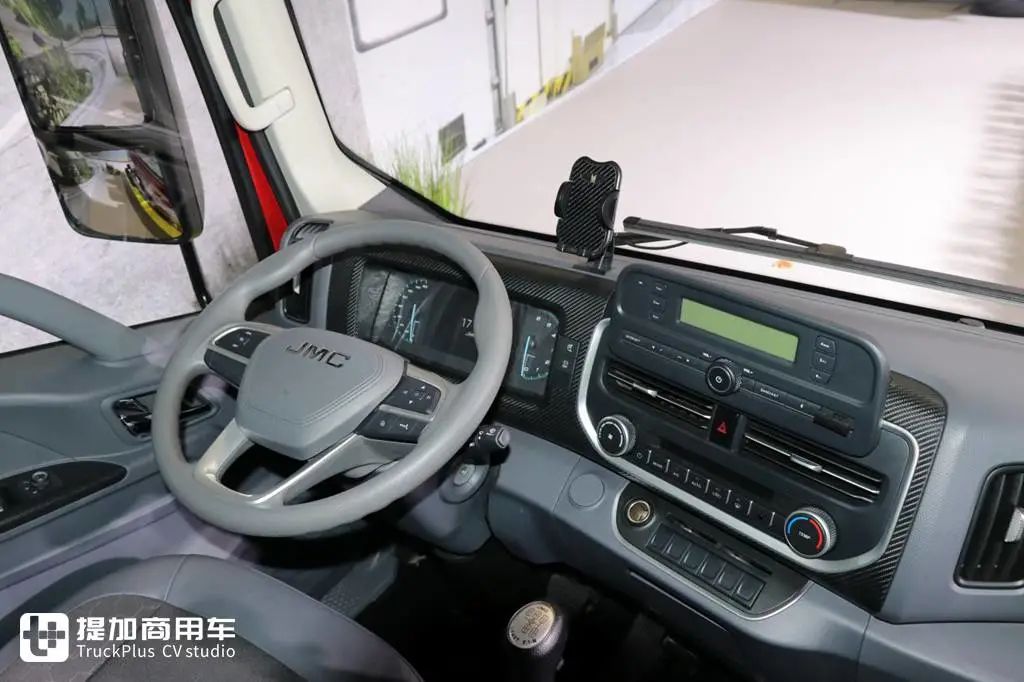 江铃凯运+的驾驶室是一个全新平台打造的驾驶室,其外观设计更加科技,两阶进气格栅的镀铬饰条闪闪发亮,挡风玻璃视野进行了加大,同时还配备了行业首创的全覆盖式导流罩,能进一步降低车辆风阻系数。