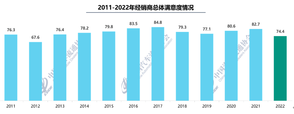 经营压力剧增,经销商对主机厂的满意度也创10年来新低。据协会数据显示,2022年汽车经销商对主机厂总体满意度得分为74.4分,创自2013年以来汽车经销商对厂家总体满意度最低水平,其中豪华/进口品牌对主机厂的满意度为79.2分,合资品牌为68.9分,而自主品牌为71.0分。