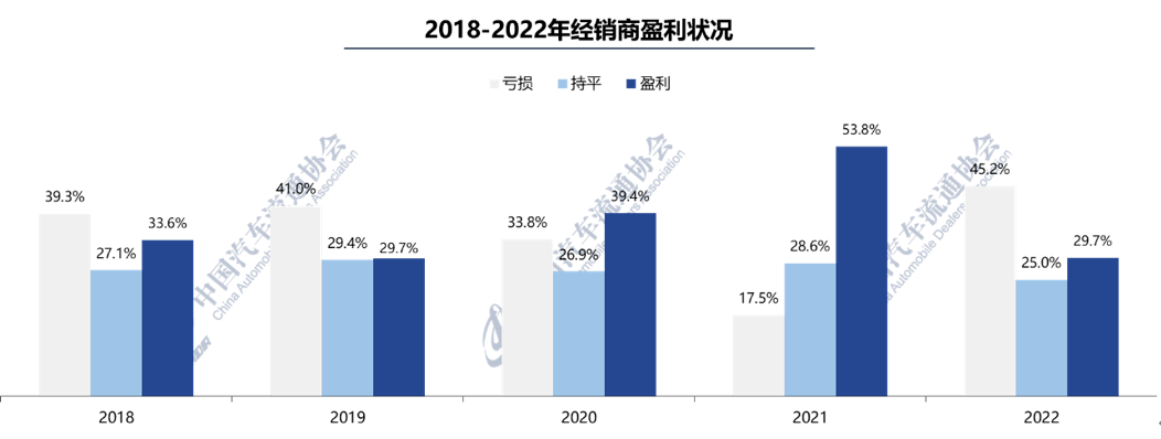 除了大部分经销商年度销售目标未能完成,大规模亏损也成为2022年经销商的发展现状。据协会调查显示,2022年经销商亏损、持平、盈利占比分别为45.2%、25.0%、29.7%,未盈利经销商占比达到70%以上,这或许是2018年以来各项数据最差的一年。分品牌来看,豪华/进口品牌整体盈利情况较好,45.9%的经销商实现盈利,合资品牌及自主品牌的盈利经销商占比分别为30.3%和23.8%。至于亏损,超五成合资品牌经销商出现亏损,自主品牌经销商为46.2%,豪华/进口品牌亏损占比为38.1%。