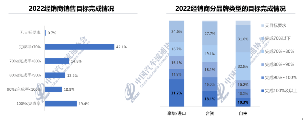 但受疫情影响,特别是第四季度,疫情快速发展且波及范围持续扩大,各地车展及营销活动无法顺利展开,汽车市场呈现相对静默的状态,客流量不可避免大幅下滑,消费者购车需求释放受阻,导致经销商经营压力激增。据中国汽车流通协会公布的数据显示,2022年只有19.4%的经销商完成年度销量目标,仅42.2%的经销商年度销量目标完成80%以上。其中,豪华/进口品牌经销商的销量情况较好,有31.7%完成年度目标,而合资品牌和自主品牌经销商年度目标完成率分别为18.1%和10.3%。