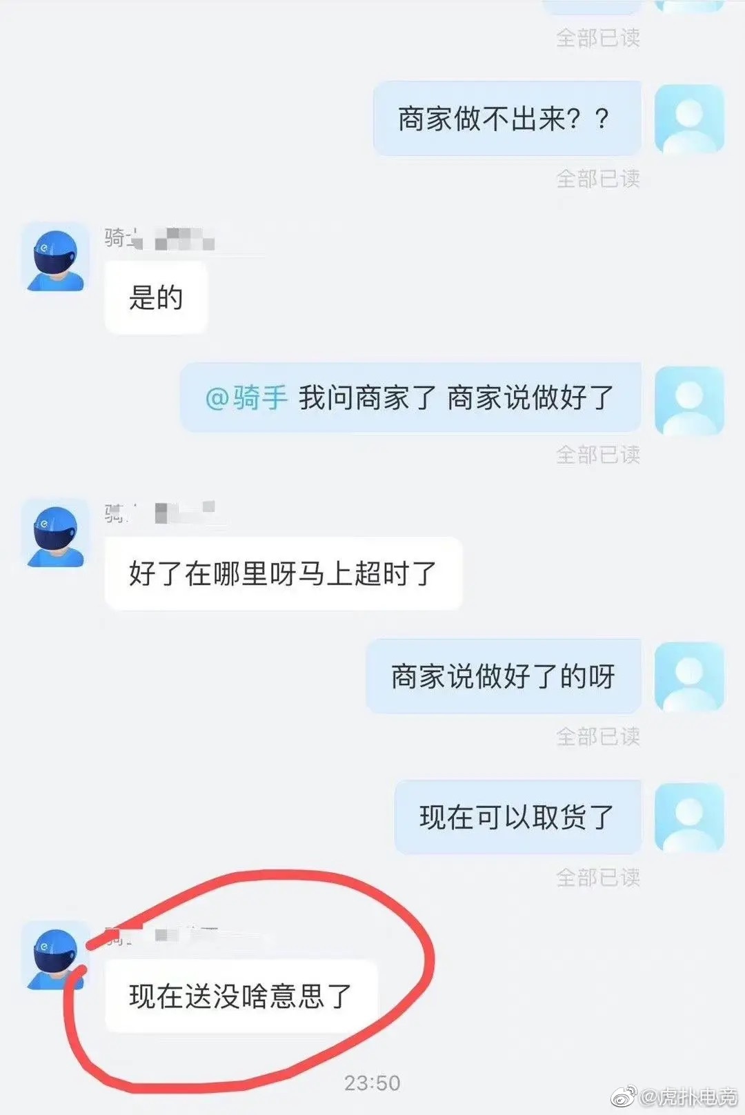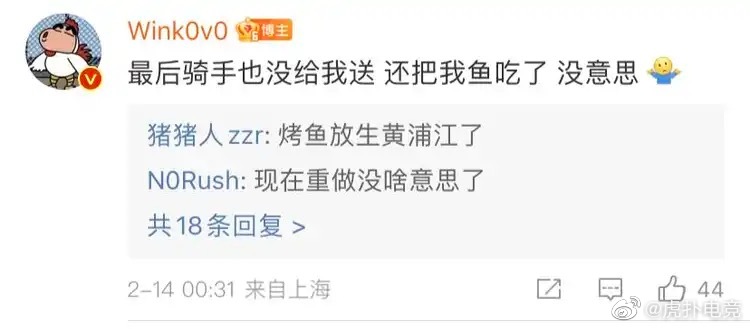 最后Wink又补充道:最后骑手也没给我送 还把我鱼吃了 没意思