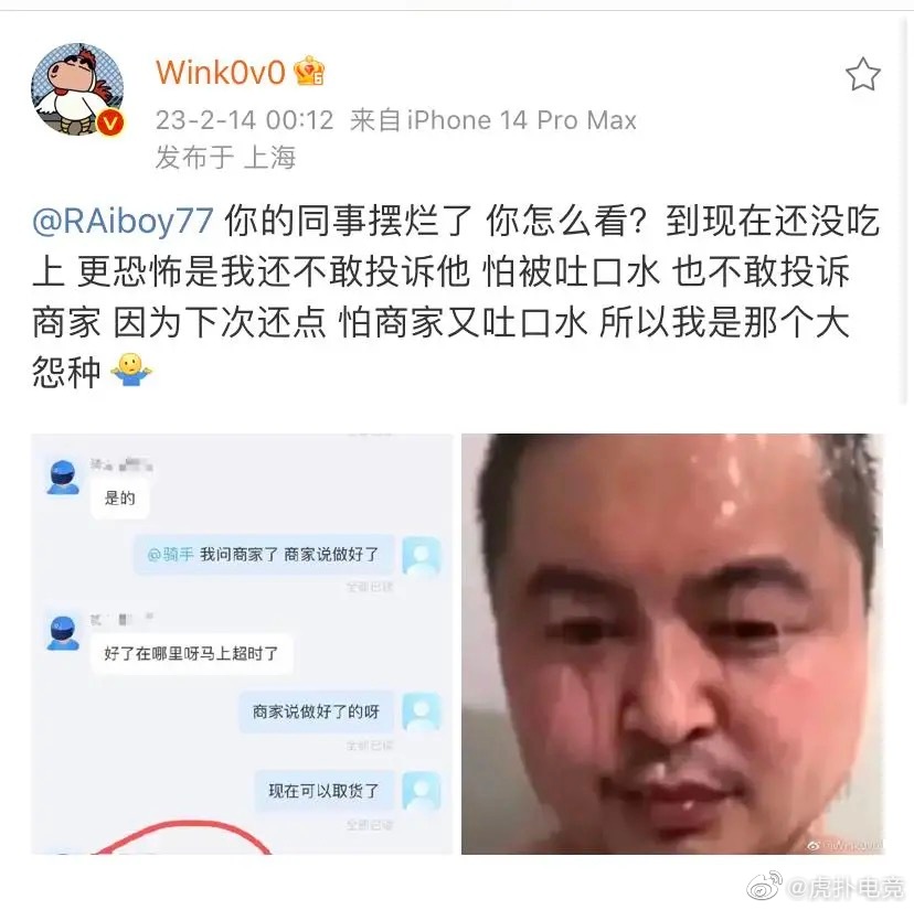 Wink发博喊话iboy:你的同事摆烂了你怎么看?到现在还没吃上,更恐怖是我还不敢投诉他,怕被吐口水 也不敢投诉商家,因为下次还点,怕商家又吐口水,所以我是那个大怨种。