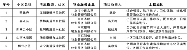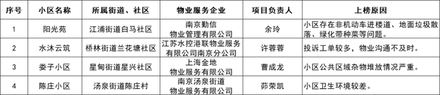 根据浦口区公布的今年1月物业服务管理“红黑榜”,有5家小区进入“红榜”,分别为熙元府、春江苑、新翠云小区、山河水花园和傅云小区,物业服务企业包括上海中建东孚、银城物业、鸿信物业等。在“黑榜”上,金地物业服务的娄子小区因公共区域杂物堆放情况严重而上榜,南京勤信物业服务的阳光苑因非机动车进楼道、绿化带种菜等原因上榜。