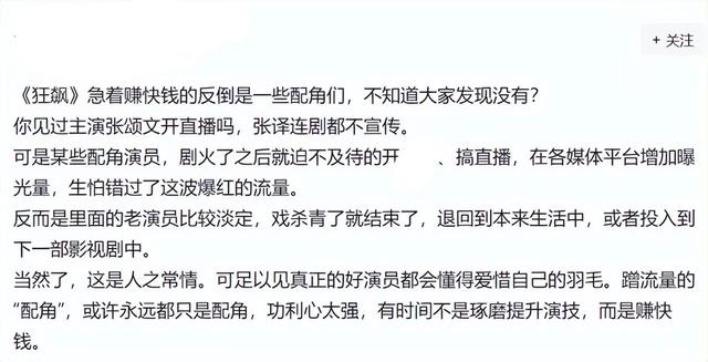 该网友表示:“《狂飙》急着赚快钱的,反倒是一些配角们,不知道大家发现没有?你见过主演张颂文开直播吗,张译连剧都不宣传。可是,某些配角演员,剧火了之后就迫不及待地搞直播,在各个媒体平台增加曝光量,生怕错过了这波爆红的流量。”