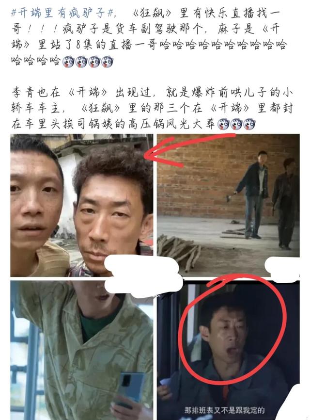 有网友表示,“《狂飙》里有快乐直播找一哥!疯驴子是货车副驾驶那个,麻子是《开端》里站了8集的直播一哥。李青也在《开端》里出现过,就是爆炸前哄儿子的小轿车车主。《狂飙》里的那三个男人,在《开端》里都封在车里头挨锅姨的高压锅风光大葬。”