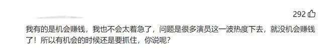 ​但对于该网友的评论,很多人并不认同。其他人表示:“我有的是机会赚钱,我也不会太着急了,问题是很多演员这一波热度下去,就没机会赚钱了!所以有机会的时候还是要抓住。”