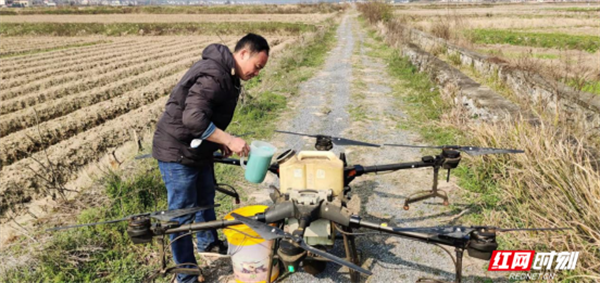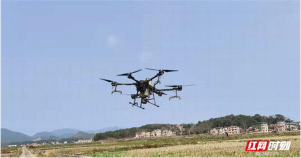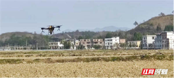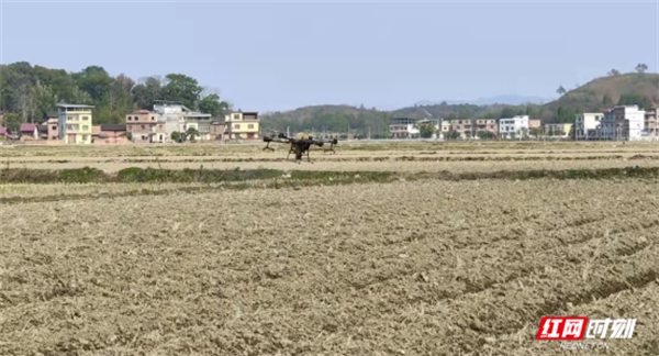 近日,在道县梅花镇宜阳大洞,一架农业专用无人机正在给即将移栽秧苗的农田撒肥消毒,操作员熟练地遥控着无人机在离地面只有2.5米的上空平稳地飞行着,绘出了一幅新科技助力春耕生产的新画卷。