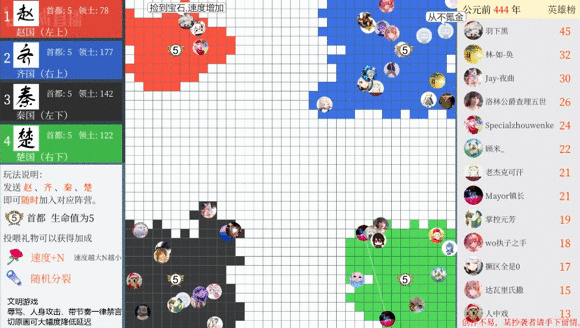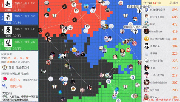 例如四国争霸就是另一个比较受欢迎的弹幕互动游戏。发送弹幕“赵、齐、秦、楚”中的一个,就能进入对应的国家。