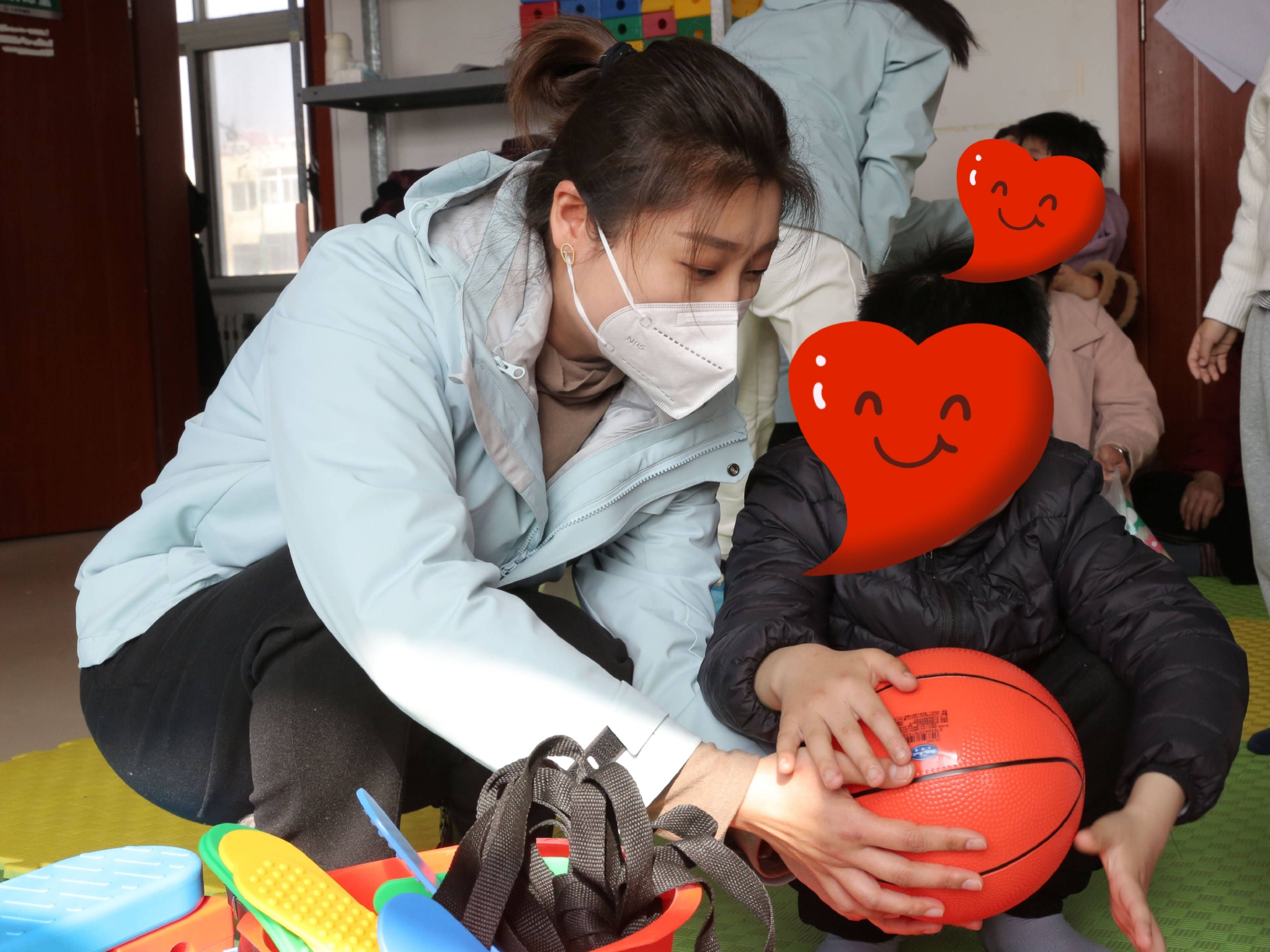 活动现场,孩子们看着崭新的绘本图书和橡皮泥、画笔等玩具,脸上流露出灿烂的笑容。接过彩笔和画纸,孩子们迫不及待地写写画画,一位小朋友还画了一颗大大的爱心送给来捐赠的阿姨们。互动环节中,培训学校的老师带着小朋友们一起学习了感通教具,“这些捐赠的通感教具可以培养小朋友的肢体平衡,通过感知训练提升孩子的注意力、运动能力。”孩子们钻过一个个圈、爬过一个个桩,在互动中感受关爱。