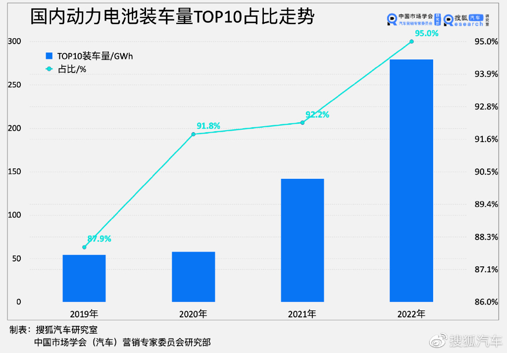 国内动力市场格局固化趋势也已经非常明显——从国内TOP10厂商所分食的整个市场份额来看,这一数据已经在逐年增长,2022年,装机量TOP10的厂商们占据了整个市场95%的份额。