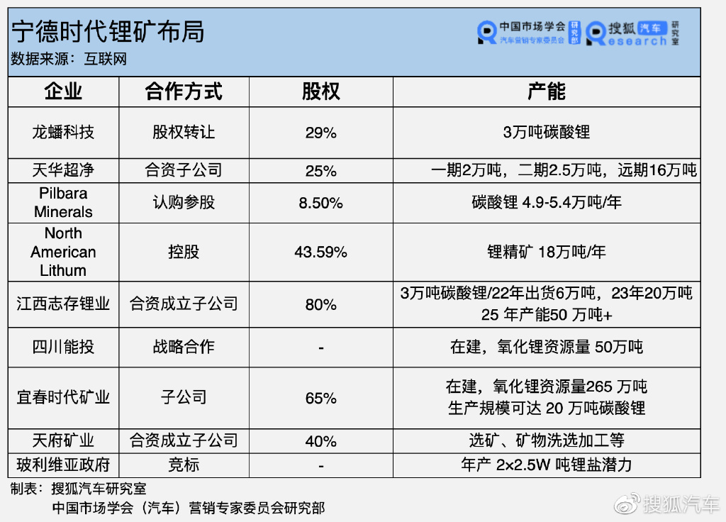 据相关统计,宁德时代通过投资、成立合资公司等手段,已经布局了包括志存锂业、天宜锂业、斯诺威矿业、以及北美锂矿等国内外锂矿资源。